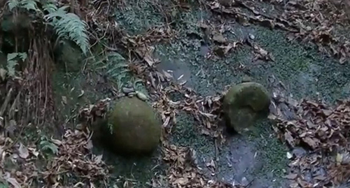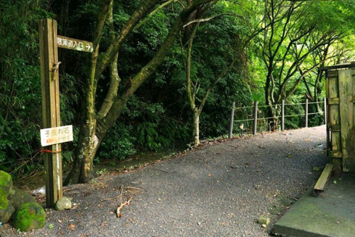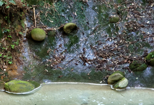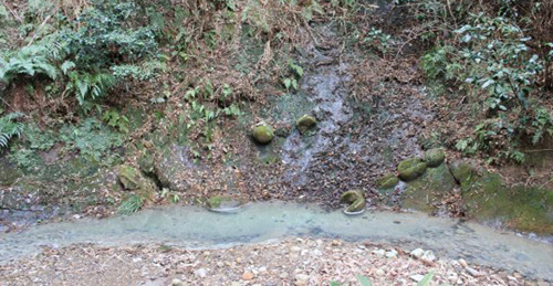 子生まれ石は駐車場から50mほど入った幅1〜2mの渓流で、川岸の岩から「石の玉 」が突き出している。