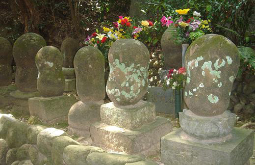 大興寺歴代住職の墓石は加工されいないまゆ型の「子生れ石」が使われている。