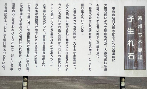 「子生まれ石」は、静岡県牧之原市西萩間にある大興寺の裏山にある石で、遠州七不思議の1つとされている。
