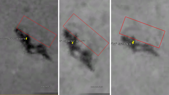 ヒトが歩行している姿にそっくり・・・・これが生命体ではないとしたら・・・いったい何?? このヒューマノイドらしき真っ黒な人型、これが生命体でなかったとしても、宇宙人が作った巨大なロボットの可能性もある。 さらにこの場所から東に600km離れた場所にも同様の物体が写りこんでいた!