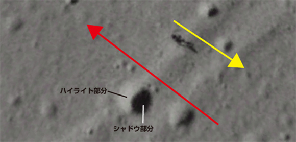 クレータの影からすると、月面に当たる光は右下から左上に向けて(赤矢印)に対し、巨人は光が左上から右下(黄矢印)についている。