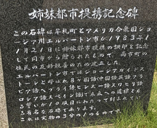 この石碑は牟礼町とアメリカ合衆国 ジョージア州エルバートン市が1983年11月21日に姉妹都市提携の調印を記念して同市から贈られたもので、両市町の住民の友好親善のため建立した。