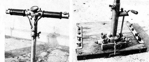 ハンドル部分から下に伸びた2本のコードは、オートバイのクラッチとブレーキのようなものだという。