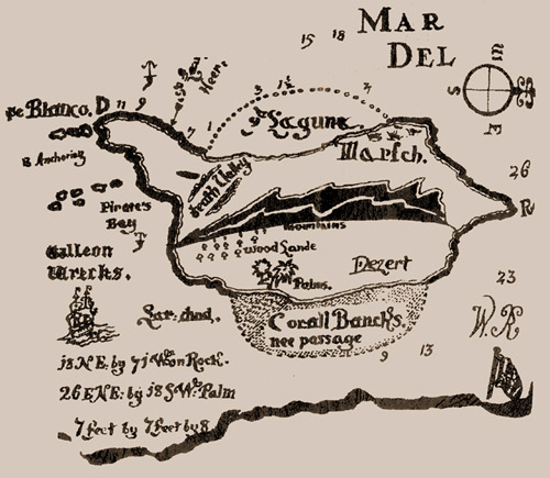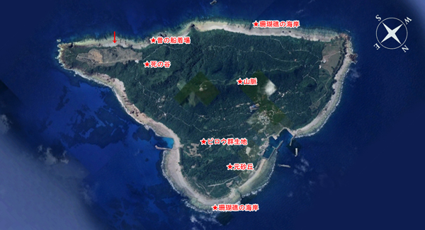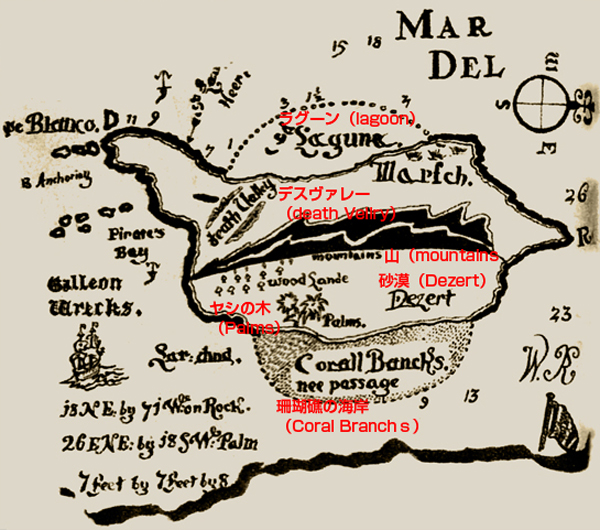 島の中央を南北に走る山脈、東海岸に発達したサンゴ礁 、砂丘、ビロウの群生地、西海岸にあるサンゴ礁の浅い海など地形がキッドの残した地図と一致するのです。