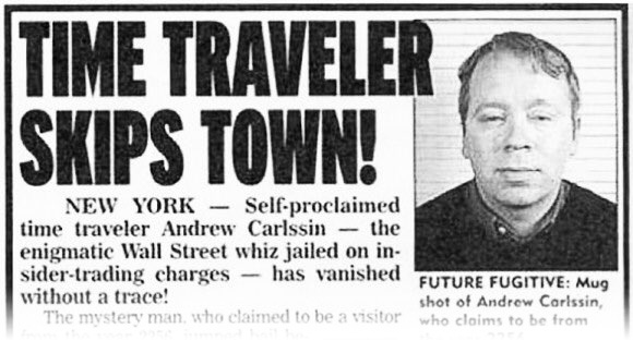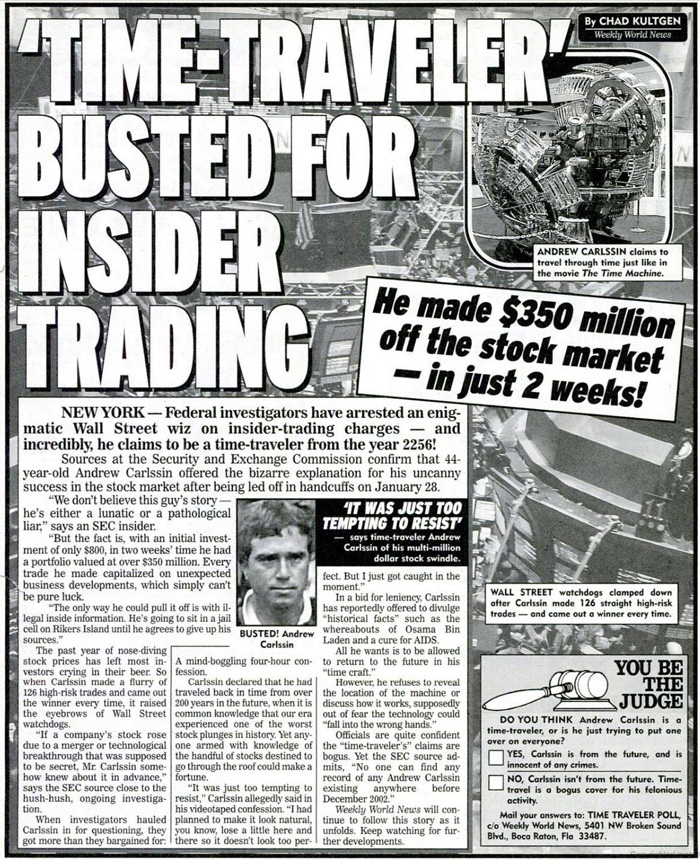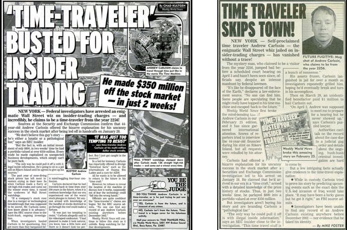 2003年3月25日、「Weekly World News」というタブロイド紙に "TIME-TRAVELER BUSTED FOR INSIDER TRADING"(タイムトラベラー、インサイダー取引で逮捕される)というタイトルの記事が掲載されました。 その後、2003年4月29日に "TIME TRAVELER SKIPS TOWN!"(タイムトラベラー、町を抜け出す!)という続編記事も掲載されました。