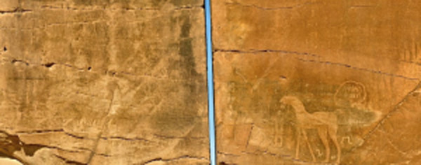 表面もまっすぐに切り取られ、表面に描かれた人や馬の壁画と文字は何を意味するのかわかっていない。