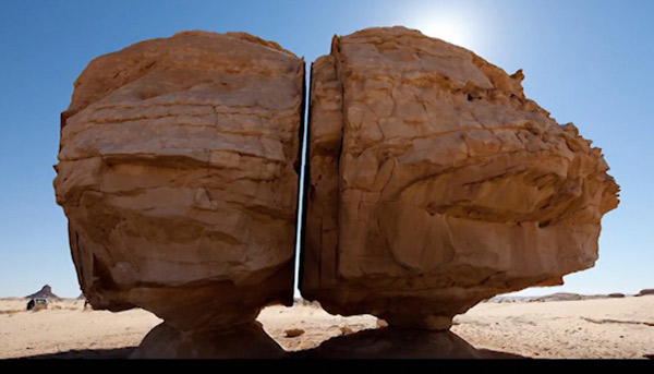 高さ9メートル、幅7.6メートルの巨石で、真ん中をレーザー光線を使って人工的に分割されたかのように、きれいに割れている。