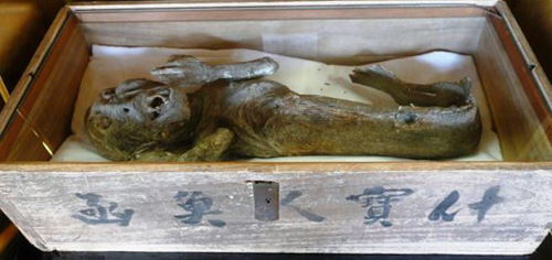 そのうちの一つ、高野山の麓にある西光寺の学文路苅萱堂の人魚のミイラ。 日本書紀に、推古天皇27年4月項に、近江国からの報告として「蒲生河に物有り。其の形人の如し」と記載されている。 それがミイラとなり、近江国出身の千里ノ前に受け継がれ、高野山の麓まで伝わったとされている。 人魚のミイラを納めた木箱のふたには、『日本書紀』と記されている。