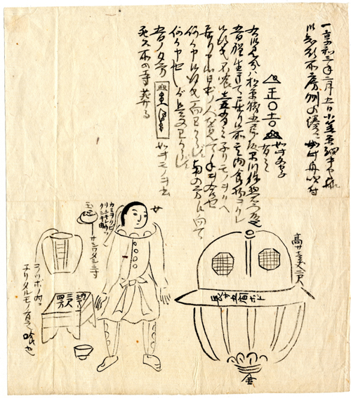 享和三年癸亥の春二月廿二日の午の時ばかりに、當時寄合席小笠原越中守〔高四千石、〕知行所常陸國はらやどりといふ濱にて、沖のかたに舟の如きもの遙に見えしかば、浦人等小船あまた漕ぎ出だしつゝ、遂に濱邊に引きつけてよく見るに、その舟のかたち、譬へば香盒(ハコ)のごとくにしてまろく長さ三間あまり、上は硝子障子にして、チヤン(松脂)をもて塗りつめ、底は鐵の板がねを段々(ダンダン)筋のごとくに張りたり。海嚴にあたるとも打ち碎かれざる爲なるべし。