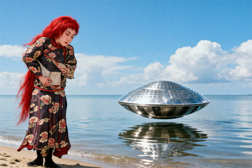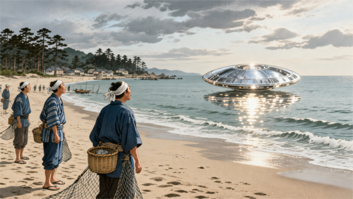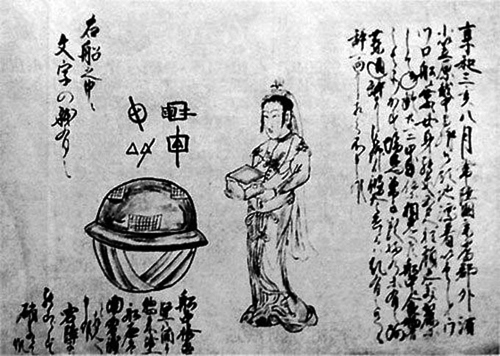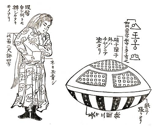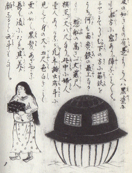 うつろ舟の中を覗いてみると、異様な姿をした美女が乗っていた。