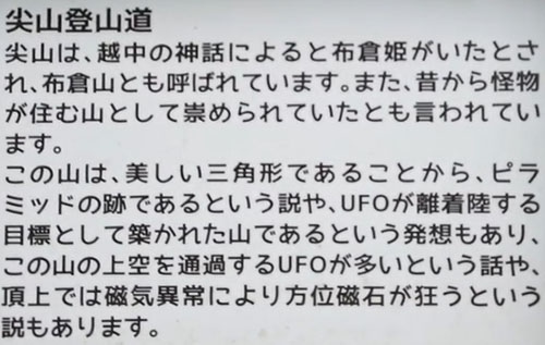 綺麗な三角形をしており古代日本のピラミッド、UFOが離着陸する目標として築かれた山だという説があり、1970年代以降この尖山上空で数多くのUFOが目撃されたという。