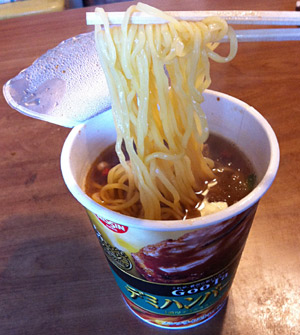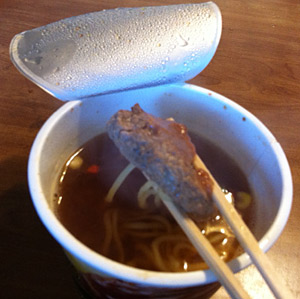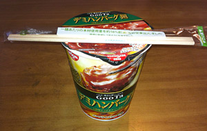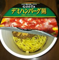 2013年5月7日(火)発売になったデミハンバーグ麺、麺の上にハンバーグが乗っている大胆な発想のカップ麺だ。