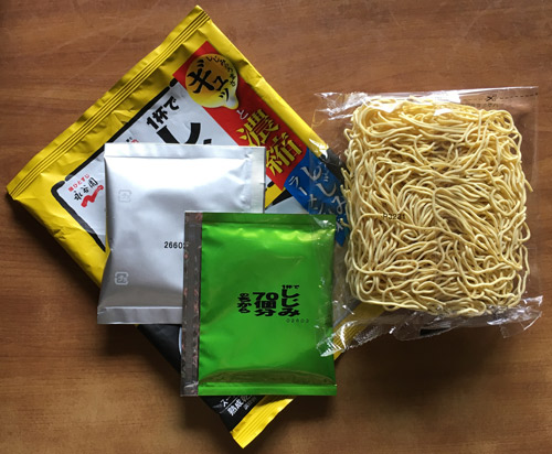 袋の中は麺、液体スープ、乾燥かやく。