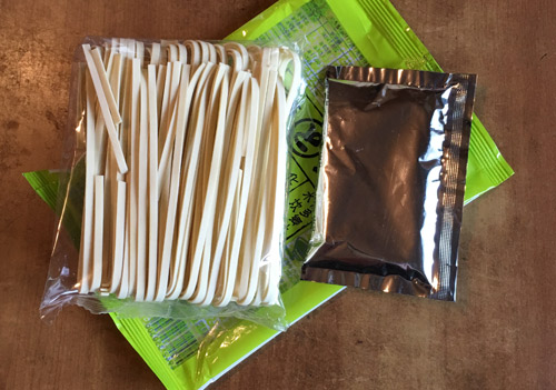 パッケージの中は、麺は平打ちの太麺と液体スープ。