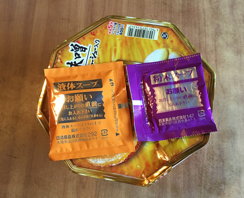 フラを開けて 粉末スープと液体スープを入れる。