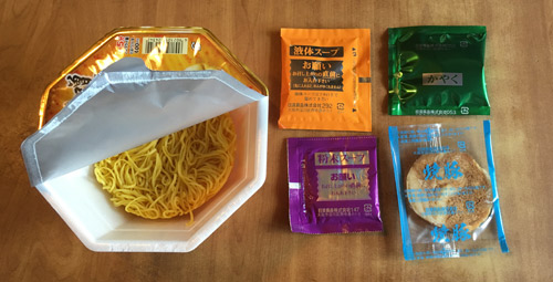 カップの中は、麺と かやく、焼豚、粉末スープ、液体スープの小袋。