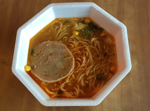 かやくはコーン、青ネギ、白ネギ、焼き豚は一般のカップ麺より厚い。
