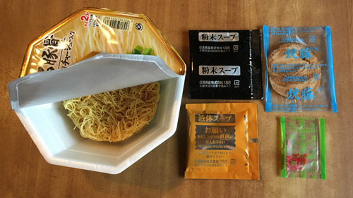 後入れ液体スープ、粉末スープ、紅生姜、焼豚かやくの4つ。