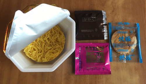 後入れ液体スープ、焼豚、かやくの3つ。