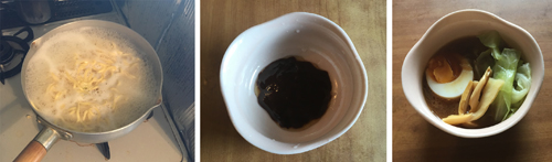 茹でてる間につけだれを器に入れて、熱湯80mlを加えてよく混ぜておく。