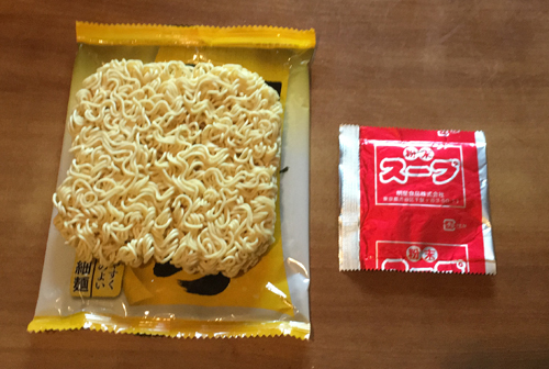 :油揚げめん(小麦粉、植物油脂、食塩)、スープ(食塩、豚・鶏エキス、糖類、たん白加水分解物、植物油脂、ごま、香辛料、しょうゆ、酵母エキス、ねぎ、香味調味料)、調味料(アミノ酸等)、炭酸カルシウム、かんすい、クチナシ色素、香料、カラメル色素、増粘多糖類、酸化防止剤(ビタミンE)、ビタミンB2、ビタミンB1、(原材料の一部に乳成分、卵、えび、さけ、さば、ゼラチンを含む)