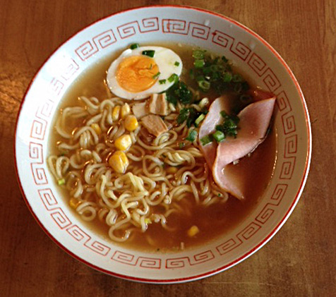 インスタントラーメンに、ハムとネギをトッピング!