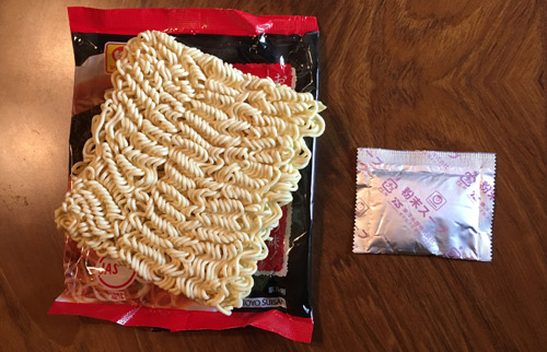 油揚げめん(小麦粉、でん粉、植物油脂、精製ラード、食塩、卵白)、添付調味料(食塩、醤油、野菜エキス、香辛料、砂糖、チキンエキス、ねぎ、たん白加水分解物、植物油)、調味料(アミノ酸等)、炭酸カルシウム、カラメル色素、かんすい、増粘多糖類、酸化防止剤(ビタミンE)、クチナシ色素、酸味料、(原材料の一部に乳成分を含む)