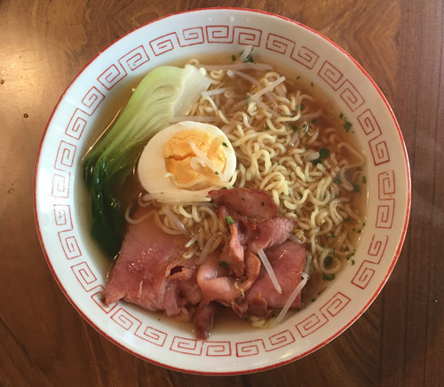 ゆで卵、焼き豚と青梗菜をトッピング。