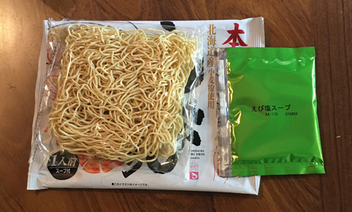 めん(小麦粉、卵白粉、食塩、小麦たん白)、しょうゆ、動物油脂、食塩、魚介エキス、肉エキス、砂糖、えび粉末、昆布エキス、香辛料/調味料(アミノ酸等)、酒精、香料、かんすい、増粘剤(加工デンプン、キサンタンガム)、着色料(クチナシ、カラメル)、酸味料、(一部に卵・小麦・えび・大豆・豚肉を含む)