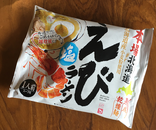 北海道産小麦粉使用し、じっくり熟成をとりながら水分だけを飛ばして乾燥させる製法の藤原製麺に、えびの旨味と香りの北海道らしい濃厚な塩ラーメン。