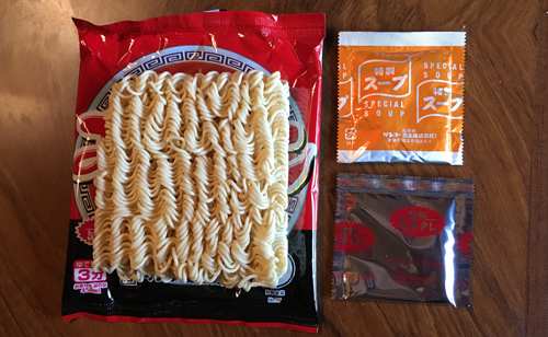 袋の中身は、麺と粉末スープ、特製旨辛タレ。