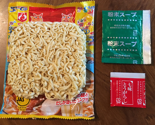 油揚げめん(小麦粉、植物油脂、食塩、酵母エキス)、スープ(食塩、魚介エキス、たん白加水分解物、豚・鶏エキス、糖類、香味調味料、香辛料、発酵調味料、昆布粉末、ねぎ、だししょうゆ、かつおぶし粉末、香味油、植物油脂)、加工でん粉、調味料(アミノ酸等)、炭酸カルシウム、トレハロース、かんすい、増粘剤(ガティガム)、カラメル色素、酸化防止剤(ビタミンE)、クチナシ色素、香料、微粒二酸化ケイ素、乳化剤、ビタミンB2、ビタミンB1、(原材料の一部に卵、乳成分、えび、ごま、さけ、さば、ゼラチンを含む)
