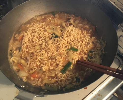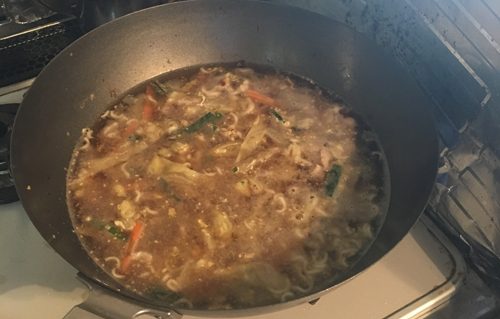 炒め終わったら500ccのお湯を入れ粉末スープを入れながらかき混ぜる。(画像は2人分)