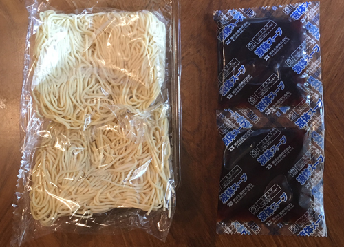 めん(小麦粉(国内製造)、食塩、卵白/加工でん粉、酒精、かんすい、トレハロース、乳酸ナトリウム、クチナシ色素、(一部に小麦・卵を含む))、添付調味料(糖類(ぶどう糖果糖液糖、砂糖)、醸造酢、たん白加水分解物、醤油、食塩、ごま油、酵母エキス/調味料(アミノ酸等)、カラメル色素、酸味料、(一部に小麦・ごま・大豆・豚肉・りんごを含む))