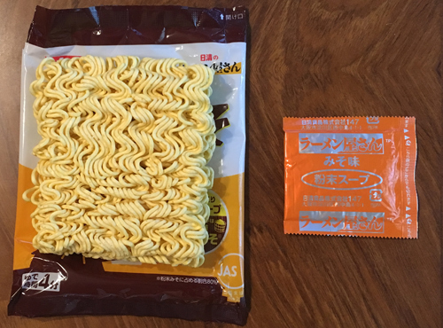 袋の中は麺と粉末スープ・・・あれ〜〜?スパイスの小袋(唐辛子)がなくなった???