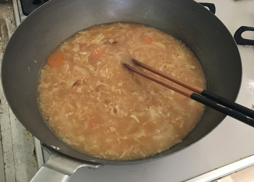 熱湯300mlを加え、みそスプとガラスープを入れる。