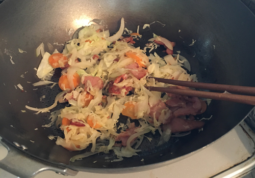 フライパンで野菜とかひき肉を炒める・・・