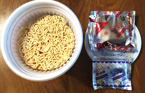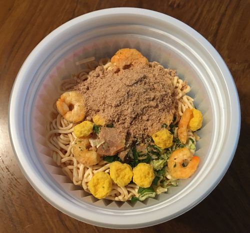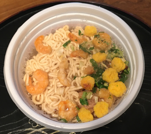 油揚げめん(小麦粉(国内製造)、ラード、植物油脂、食塩、醤油、蛋白加水分解物)、スープ(食塩、粉末醤油、香辛料、糖類、酵母エキス、チキンエキス、ポークエキス、椎茸エキス、魚介エキス、野菜エキス、植物油脂)、かやく(味付えび、味付豚肉、味付卵、ねぎ、味付椎茸)/加工でん粉、調味料(アミノ酸等)、炭酸Ca、かんすい、増粘剤(グァーガム、カゼインNa)、着色料(カラメル、カロチノイド)、トレハロース、pH調整剤、酸化防止剤(ビタミンE、ビタミンC)、酸味料、甘味料(カンゾウ、ステビア)、ビタミンB2、ビタミンB1、(一部に小麦・卵・乳成分・えび・大豆・鶏肉・豚肉・ごまを含む)