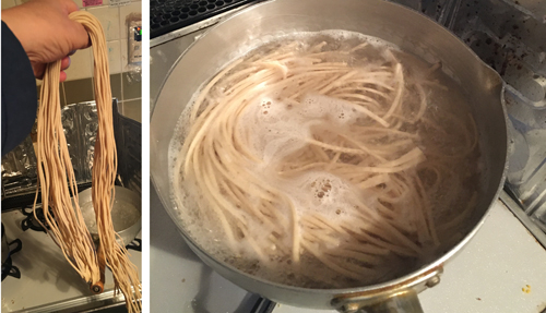 麺(半生麺)の長さが約1mあるので適当な長さに切って鍋に・・・。