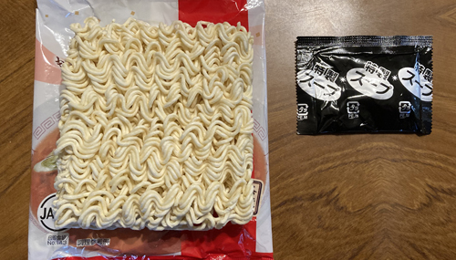 ●原 材 料 ;油揚げめん(小麦粉、植物油脂、食塩、卵白)、スープ(食塩、砂糖、醤油、香辛料、チキンエキス、たん白加水分解物、オニオンパウダー、ねぎ、ポークエキス、香味油)、加工でん粉、調味料(アミノ酸等)、カラメル色素、かんすい、増粘剤(グァーガム)、酸化防止剤(ビタミンE)、クチナシ色素、香料、(原材料の一部に乳成分、ごまを含む)