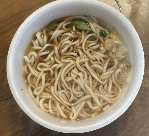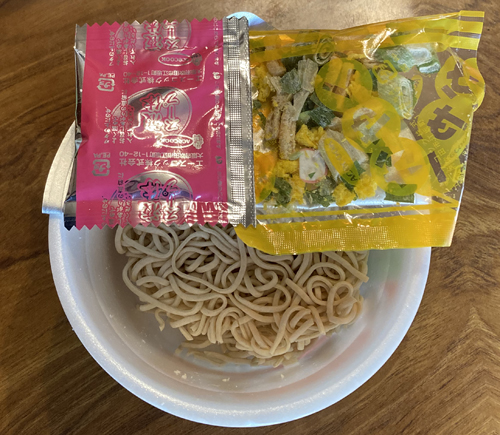 ●原 材 料 ;油揚げめん(小麦粉(国内製造)、植物油脂、もち大麦粉、食塩、植物性たん白)、スープ(しょうゆ、たん白加水分解物、食塩、魚介エキス、カツオブシパウダー、砂糖、コンブエキス、酵母エキス、カツオブシ、コンブ)、かやく(卵、油揚げ、ねぎ、かまぼこ)/調味料(アミノ酸等)、酒精、炭酸Ca、カラメル色素、炭酸K、酸化防止剤(ビタミンE)、炭酸Na、カロチノイド色素、甘味料(スクラロース)、増粘剤(キサンタンガム)、紅麹色素、(一部に小麦・卵・さば・大豆を含む)