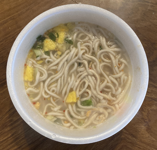 麺と粉末スープ、程良く味付けした鶏肉そぼろ、シャキシャキとした食感の良いキャベツ、ふんわりとした食感の卵、彩りの良いねぎ、唐辛子を加えて仕上げたカヤク類。