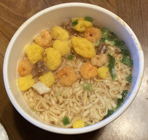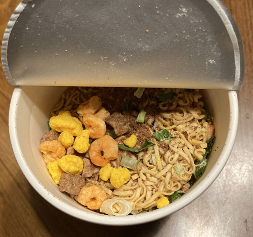 ●原 材 料 ;油揚げめん(小麦粉、植物油脂、食塩、チキンエキス、ポークエキス、しょうゆ、たん白加水分解物、香辛料)、かやく(味付豚ミンチ、味付卵、味付えび、味付豚肉、ねぎ)、スープ(糖類、粉末しょうゆ、食塩、香辛料、たん白加水分解物、香味調味料、ポークエキス、メンマパウダー)/加工でん粉、調味料(アミノ酸等)、炭酸Ca、カラメル色素、かんすい、増粘多糖類、カロチノイド色素、酸化防止剤(ビタミンE)、乳化剤、香辛料抽出物、香料、ビタミンB2、くん液、ビタミンB1、酸味料、(一部にえび・小麦・卵・乳成分・ごま・大豆・鶏肉・豚肉を含む)