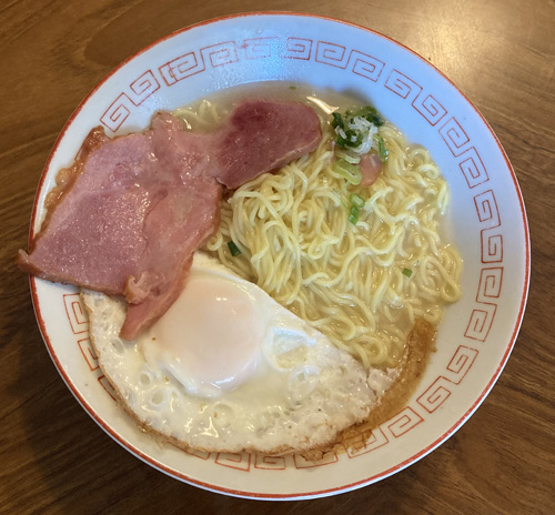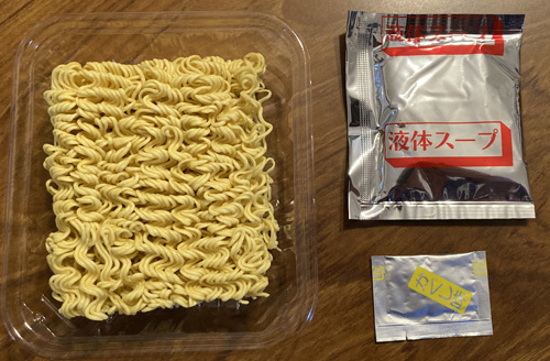 ●原 材 料 ;めん(小麦粉(国内製造)、小麦たん白、食塩、植物油脂、乾燥卵白、たん白加水分解物)、スープ(ポークエキス、しょうゆ、食塩、香味油、動物油脂、脱脂粉乳、魚介エキス、たん白加水分解物、植物油脂、麦芽糖、魚介粉末、昆布エキス、昆布エキスパウダー、香辛料)/加工デンプン、調味料(アミノ酸等)、かんすい、増粘剤(加工デンプン、増粘多糖類)、着色料(クチナシ、カラメル)、酸化防止剤(V.E、V.C、ローズマリー抽出物)、乳化剤、(一部に卵・乳成分・小麦・さば・大豆・豚肉・ゼラチンを含む)