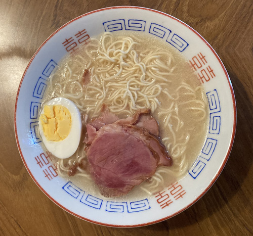 生麺うまいまま製法による、歯切れがよい硬めの細麺に、ガーリックで旨みをつけた味わい深い豚骨味スープ。