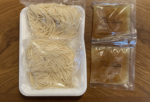 スープ:動物油脂、チキンエキス、食塩、植物油脂、砂糖、しょうゆ、たん白加水分解、はまぐりエキス、昆布エキス、かつお節エキス、香辛料/調味料(アミノ酸等)、酒精、香料、増粘剤(キサンタン)、酸化防止剤(ビタミンE)、カラメル色素、(一部に小麦・牛肉・大豆・鶏肉・豚肉を含む)