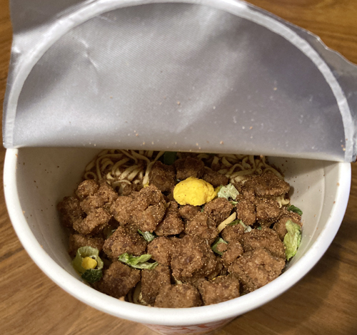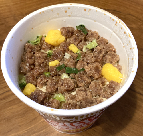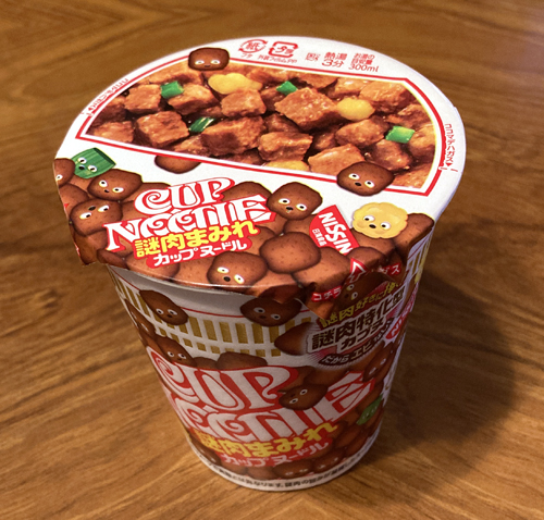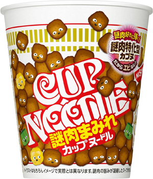 通常品の約4倍量の謎肉がごろごろと入った「カップヌードル」です。おなじみのオリジナルスープに染み出した謎肉のうまみが食欲をそそります。