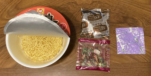うまそうな匂いがする中の、戻しの熱湯5分は、待ちきれない〜〜(笑)