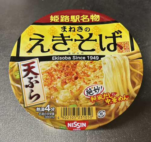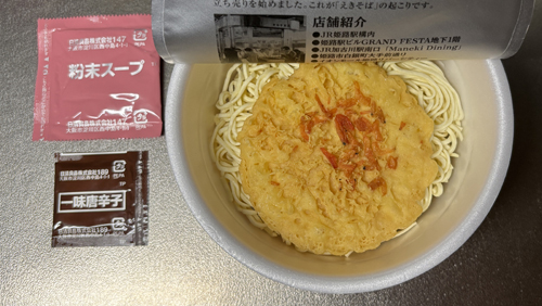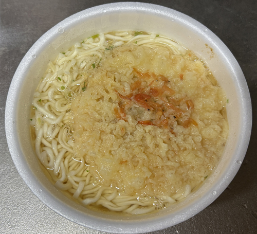 ●原材料名:油揚げめん(小麦粉(国内製造)、植物油脂、食塩)、かやく(天ぷら)、スープ(食塩、粉末しょうゆ、魚粉、ねぎ、一味唐辛子、たん白加水分解物、糖類、昆布調味料、酵母エキス、植物油脂)/加工でん粉、調味料(アミノ酸等)、かんすい、炭酸Ca、カラメル色素、カロチノイド色素、酸味料、酸化防止剤(ビタミンE)、リン酸塩(Na)、ビタミンB2、ベニコウジ色素、ビタミンB1、(一部にえび・小麦・卵・乳成分・さば・大豆を含む)