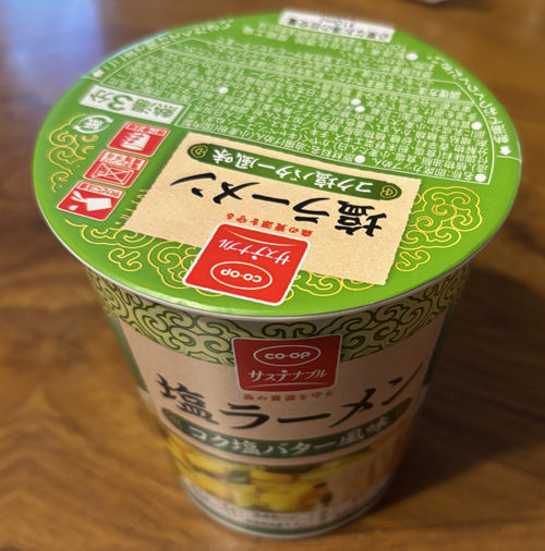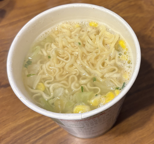 あっさり食べやすい塩ラーメンです。バター風味がほのかに香るスープに、具はキャベツ、コーン、ねぎを使用しています。